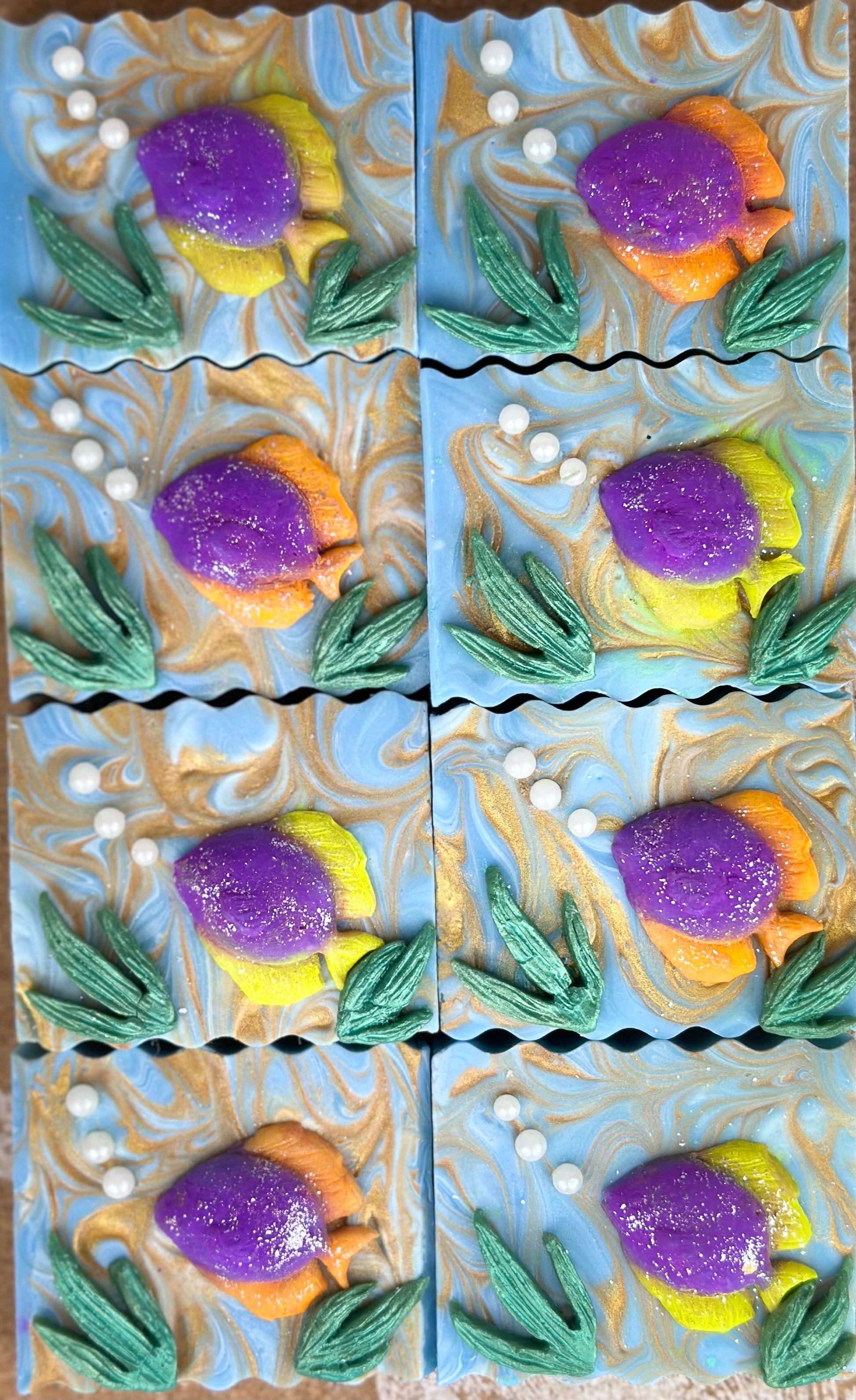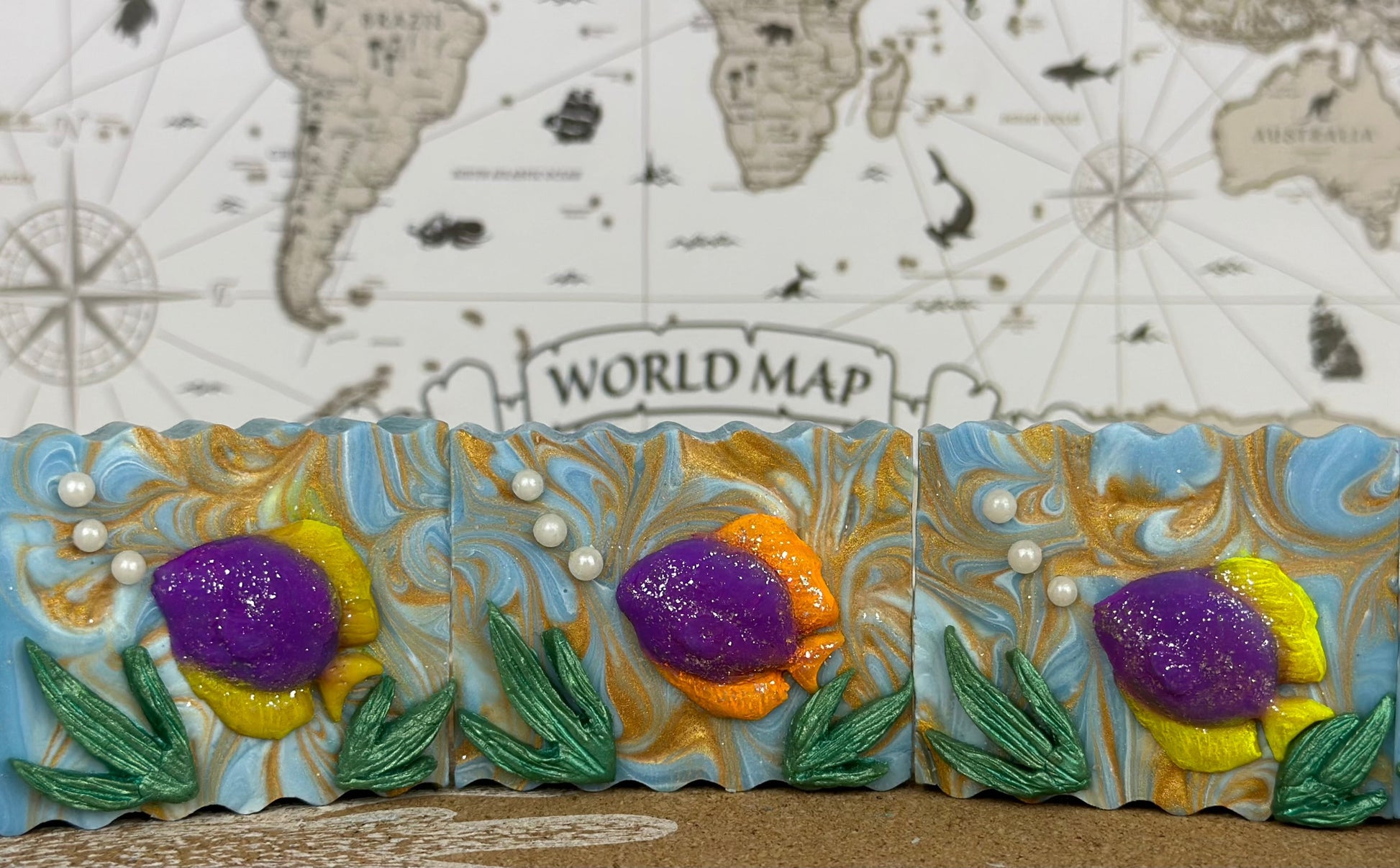 Moonlight dances on the quiet ripples of a faraway pond as the sweet florals of water lotus, white cyclamen, and night-blooming jasmine mingle with bright mandarin zest, lemon, and sleepy musk. The scent is gentle and caressing. It compliments the soap design and colors so perfectly, making this beautiful soap an enchanting gift!